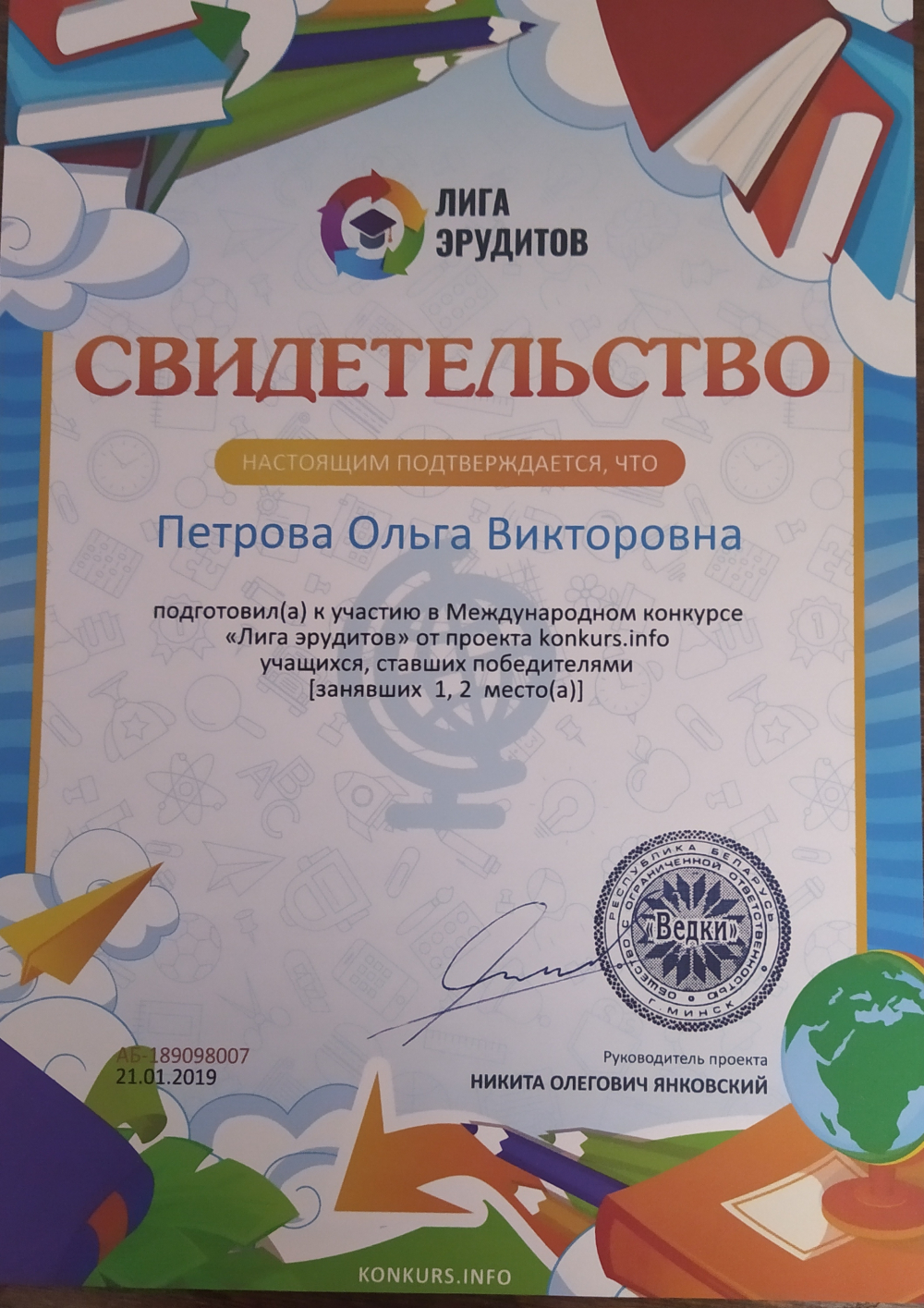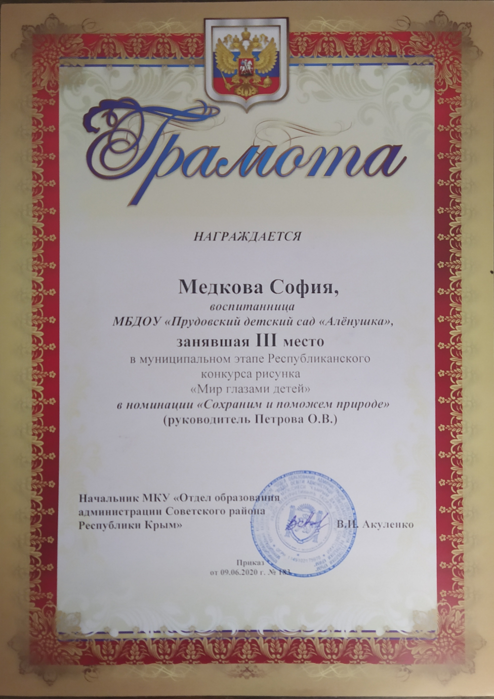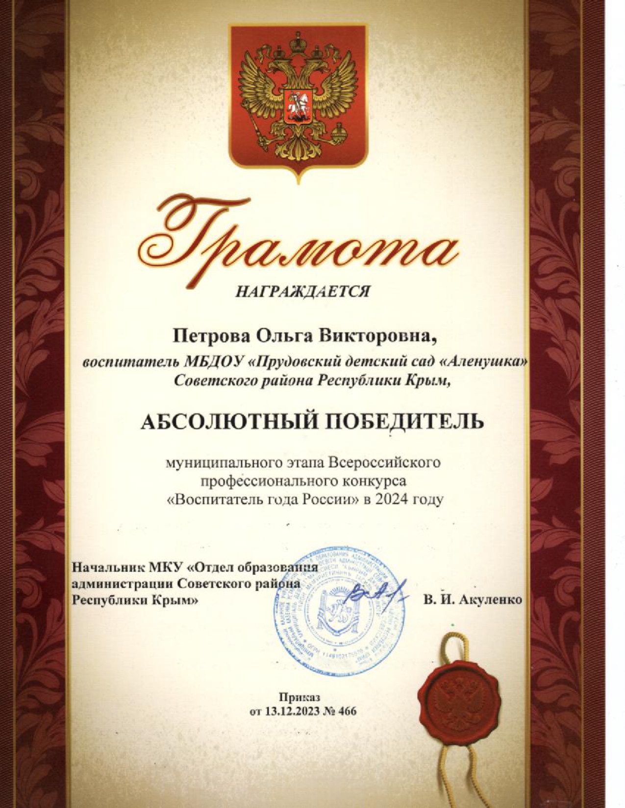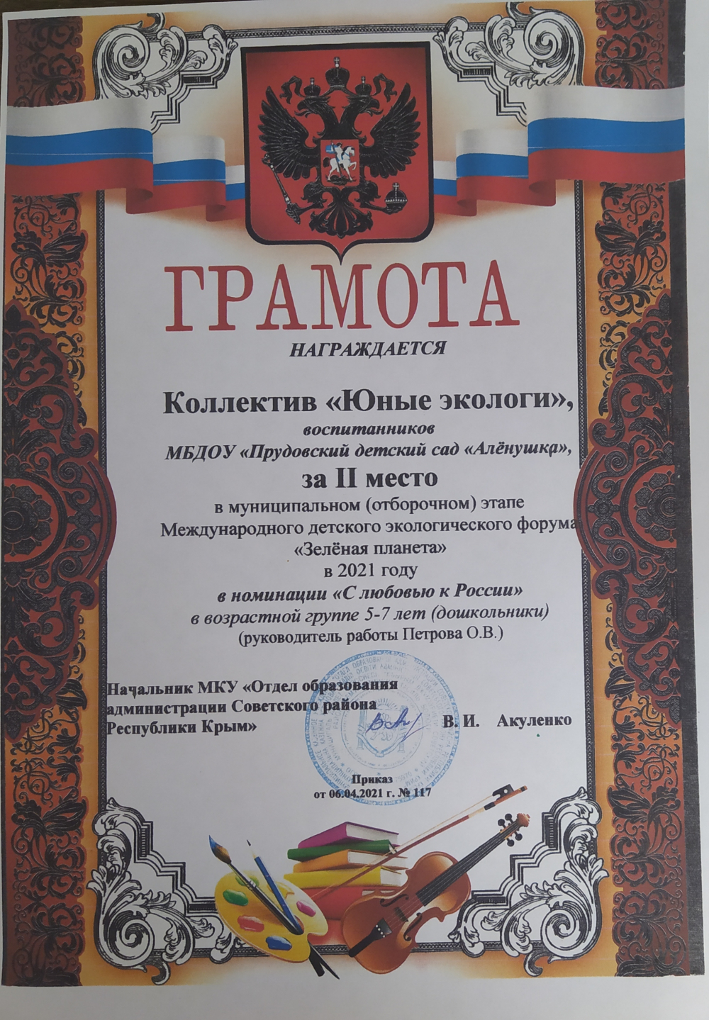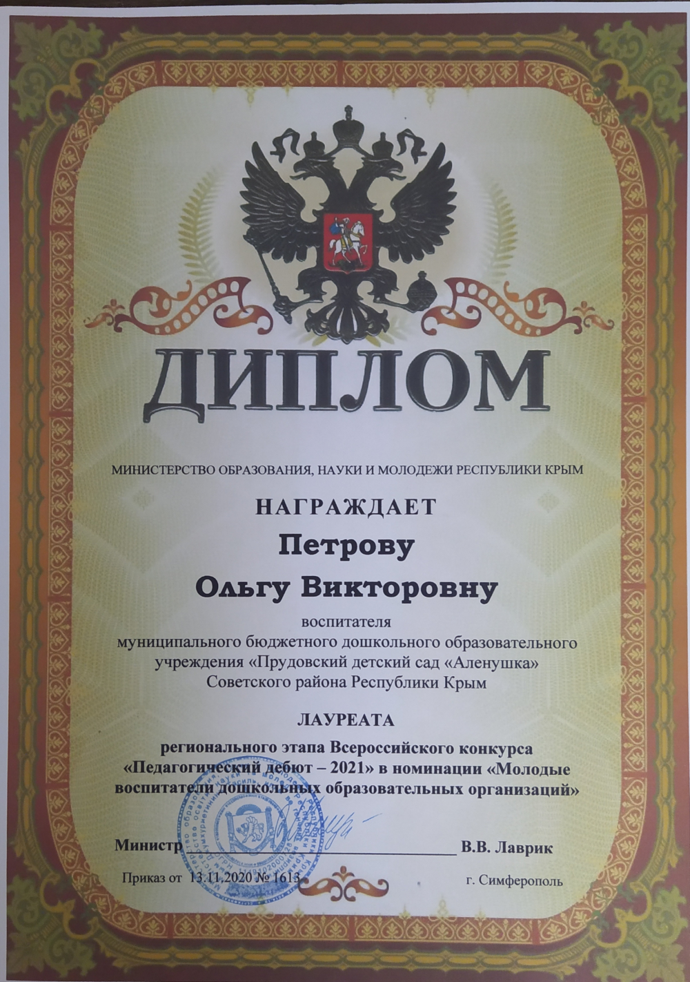 Крымский республиканский институт постдипломного педагогического образования по программе "Особенности реализации регионального компонента в дошкольной образовательной организации Республики Крым", 26.09.2022 - 30.09.2022 - 36ч.
