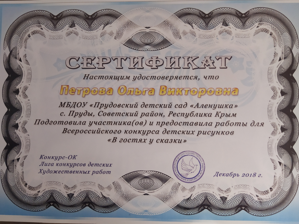 Крымский республиканский институт постдипломного педагогического образования по программе "Воспитательно-образовательная деятельность в дошкольной образовательной организации в условиях реализации регионального компонента в соответствии с требованиями ФГОС ДО", 11.11.2019 - 22.11.2019 - 72ч.