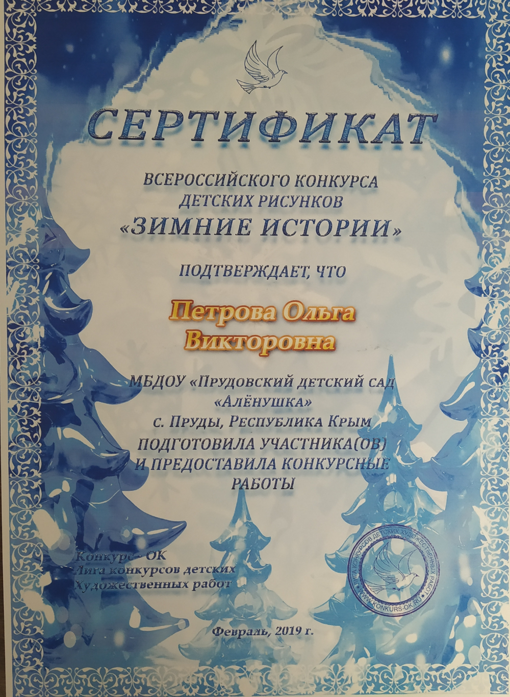 Крымский республиканский институт постдипломного педагогического образования по программе "Формирование готовности воспитателя (молодого специалиста) ДОО к профессиональному саморазвитию (в т.ч. в условиях дистанционного обучения)" 28.02.2022г- 04.03.2022 - 36ч.